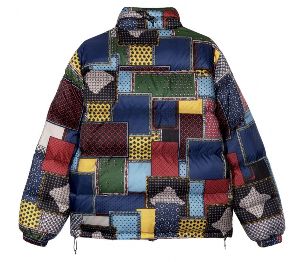 マイクロリップストップ織りのポリエステル地にダウンを充填した肉厚なパファージャケット。ベーシックなステッチワークを施した前身頃にジップポケット付き。トラディショナルなパッチワークの総柄プリント。